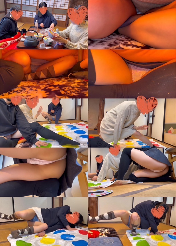 こたつの中にスマホを入れて親子3人のこたつの中のパンチラ。軽くおやつを食べた後は、私叔父が持ち込んだツイスターゲームをやる事に。